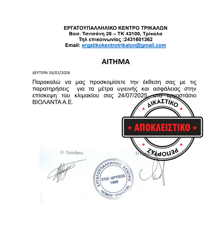 «Παρακαλώ να μας προσκομίσετε την έκθεση σας με τις παρατηρήσεις για τα μέτρα υγιεινής και ασφάλειας στην επίσκεψη του κλιμακίου σας 24/07/2025, στο εργοστάσιο ΒΙΟΛΑΝΤΑ ΑΕ» επισημαίνεται χαρακτηριστικά στο αίτημα του Εργατικού Κέντρο Τρικάλων.