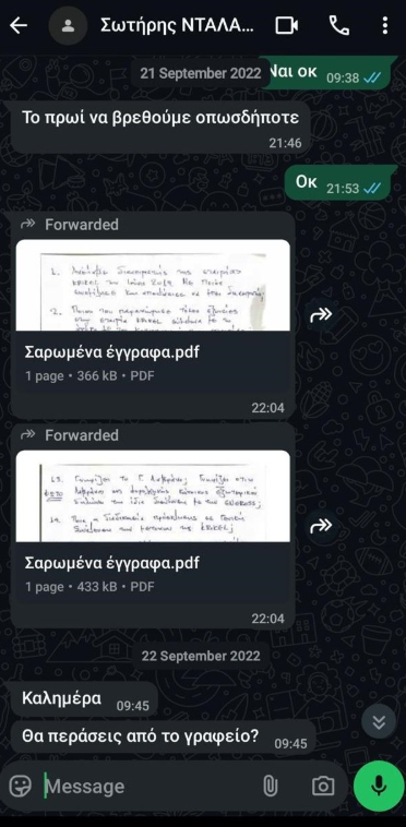 Ιδιαίτερη βαρύτητα δόθηκε, τέλος, σε μηνύματα μεταξύ του κατηγορουμένου Γιάννη Λαβράνου και του φερόμενου ως νόμιμου εκπροσώπου της εταιρείας, Σταμάτη Τρίμπαλη. Από το περιεχόμενό τους προκύπτει -όπως και ο ίδιος παραδέχθηκε καταθέτοντας-  ότι καθοδηγήθηκε τόσο ως προς τις ερωτήσεις και τη στάση του στην Εξεταστική Επιτροπή της Βουλής για τις υποκλοπές, όσο και αναφορικά με την κατ’ οίκον έρευνα των αστυνομικών αρχών. Υπενθυμίζεται οτι για τα εν λόγω μηνύματα ο Σωτήρης Ντάλλας, στη δική του κατάθεση, ερωτηθείς από το Ζαχαρία Κεσσέ πουλούσε “τρέλα”, αποφεύγοντας να απαντήσει στην ουσία των ερωτήσεων.