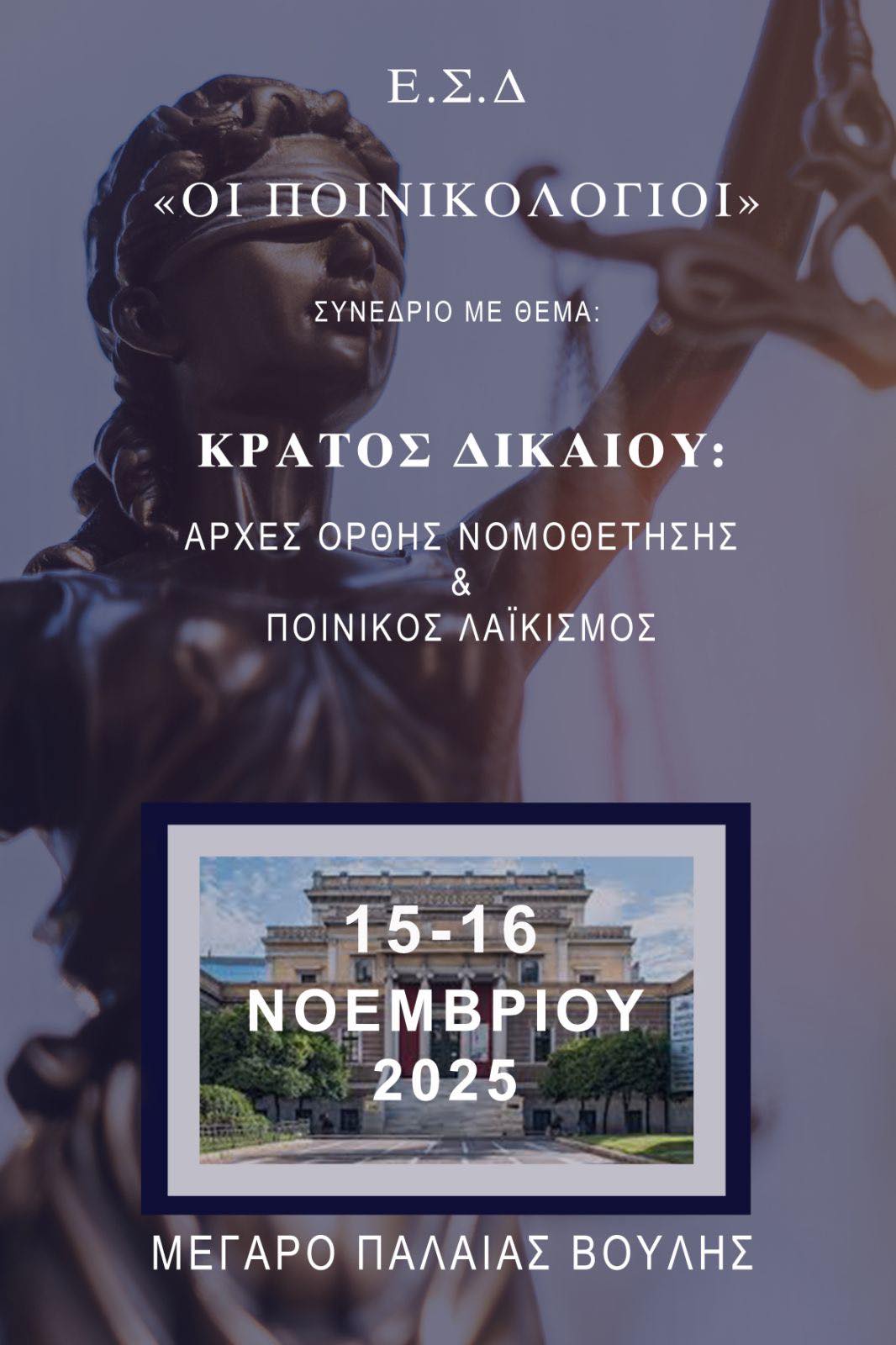 Διήμερο συνέδριο με θέμα το Κράτος Δικαίου διοργανώνει ο «Επιστημονικός Σύνδεσμος Δικηγόρων, οι Ποινικολόγιοι» στις 15 και 16 Νοεμβρίου. Ο τόπος διεξαγωγής του συνεδρίου είναι το Μέγαρο της Παλαιάς Βουλής, ενώ ο τίτλος του είναι «Κράτος Δικαίου: Αρχές Ορθής Νομοθέτησης και Ποινικός Λαϊκισμός».