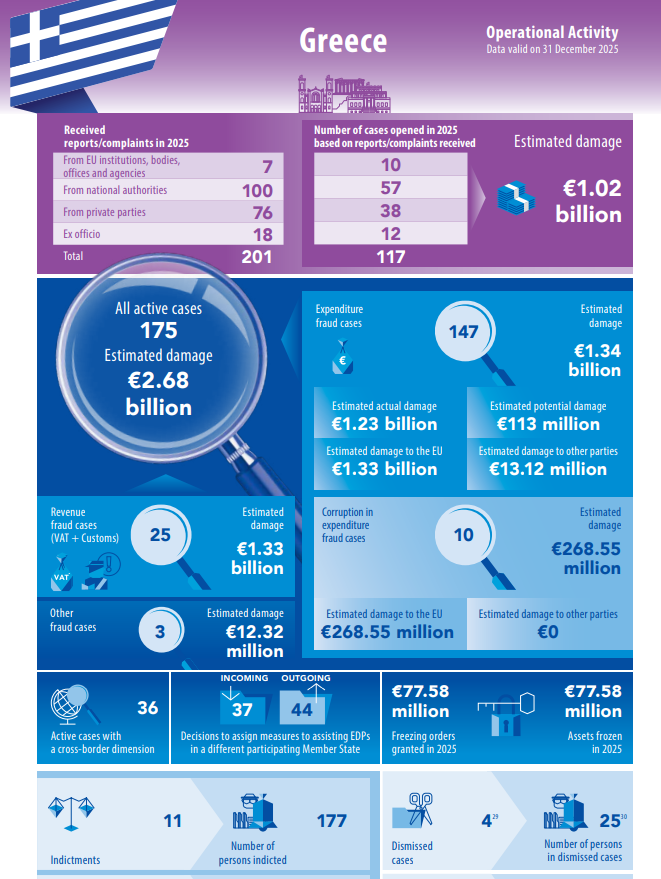 Όπως επισημαίνεται στην έκθεση, το 2025 οι υποθέσεις που ανοίχτηκαν στην Ελλάδα ανήλθαν σε 117 με την εκτιμώμενη ζημία για τον κοινοτικό προϋπολογισμό να ανέρχεται σε 1,02 δισεκατομμύρια ευρώ. Από το σύνολο των 117 υποθέσεων οι 100 προήλθαν από στοιχεία που διαβίβασαν οι εθνικές αρχές, οι 76 από ιδιώτες, οι 7 από θεσμικά όργανα, φορείς, γραφεία και υπηρεσίες της ΕΕ και οι 18 αυτεπάγγελτα.
