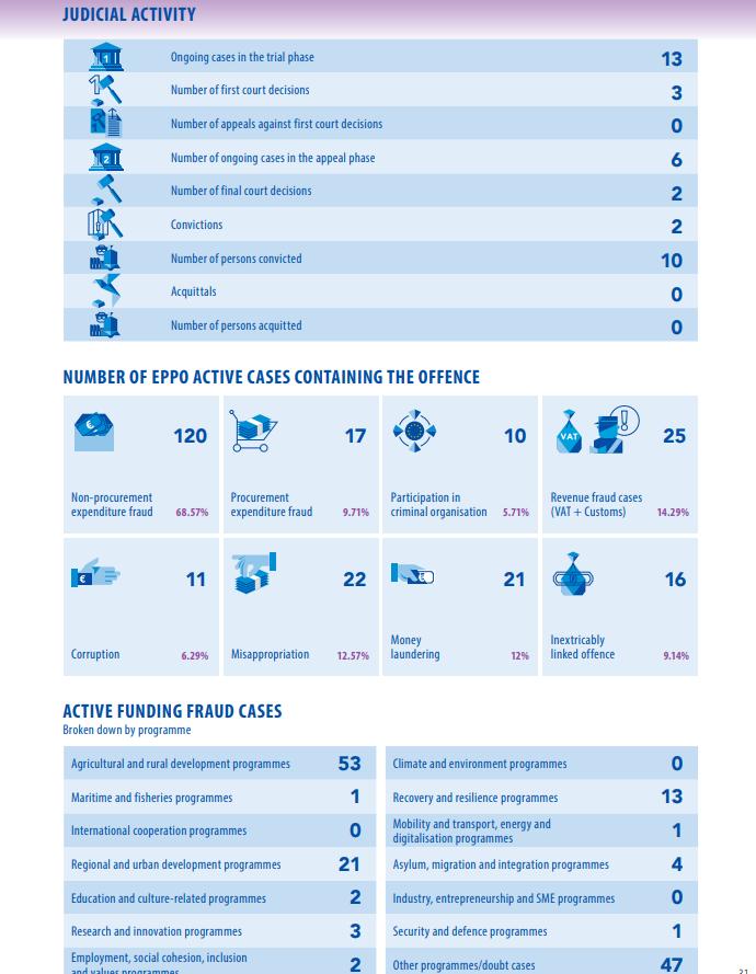 Συνολικά για το σύνολο της ΕΕ, οι υποθέσεις που ερεύνησε η Ευρωπαϊκή Εισαγγελία το 2025 ανήλθαν σε 3.602, (αύξηση 35 % από το 2024), με συνολική εκτιμώμενη ζημία 67,27 δισ. ευρώ για τον προϋπολογισμό της ΕΕ και τους εθνικούς προϋπολογισμούς. Πάνω από τα δύο τρίτα της εκτιμώμενης ζημίας (45,01 δισ. ευρώ) συνδέονται με απάτες στον τομέα του ΦΠΑ και των τελωνείων, «φέρνοντας στο φως μια εγκληματική βιομηχανία που έχει αγνοηθεί ή ανεχθεί για πολύ καιρό».