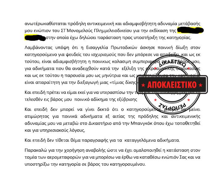 Τι και αν  η συγκεκριμένη διπλωματική υπάλληλος είχε προσκομίσει μέσω του δικηγόρου της έγγραφη βεβαίωση ότι λόγω έκτακτης κατάστασης πολέμου  δεν πραγματοποιούνται πτήσεις  με ενδιάμεσο σταθμό αεροδρόμιο των χωρών του κόλπου, και ότι οι πτήσεις μέσω Κωνσταντινούπολης αφ’ ενός δεν εξυπηρετούσαν τις συγκεκριμένες ημερομηνίες εκδίκασης  της υπόθεσης, και αφετέρου κόστιζαν 4.000 και 10.000 ευρώ για απλή διαδρομή ( ούτε καν επιστροφής). Τι και αν ο νόμος προέβλεπε την δυνατότητα  ικανοποίησης του αιτήματος αναβολής της υπόθεσης για λόγους ανωτέρας  βίας,  καθώς λόγω του πολέμου στο Ιράν δεν πραγματοποιούνται πτήσεις από την Ταϊλάνδη προς την Ελλάδα με ενδιάμεσο σταθμό τις χώρες του Κόλπου.