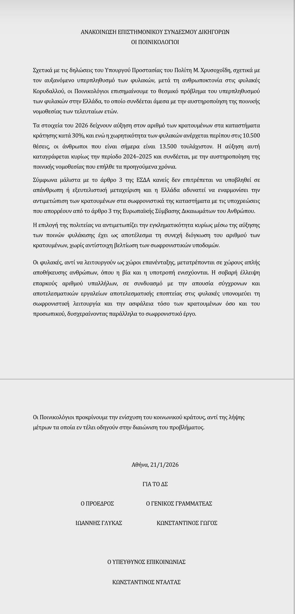 Αναλυτικά η ανακοίνωση του ΕΣΔ «Οι Ποινικολόγιοι»: