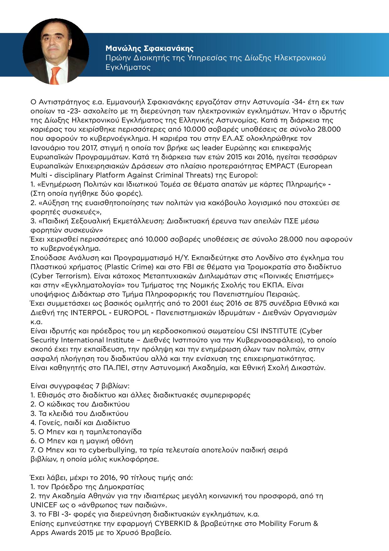 - Μανώλης Σφακιανάκης, Πρόεδρος Διεθνούς Ινστιτούτου Κυβερνοασφάλειας, ειδικός ερευνητής ηλεκτρονικών εγκλημάτων, αντιστράτηγος εα ΕΛ.ΑΣ.