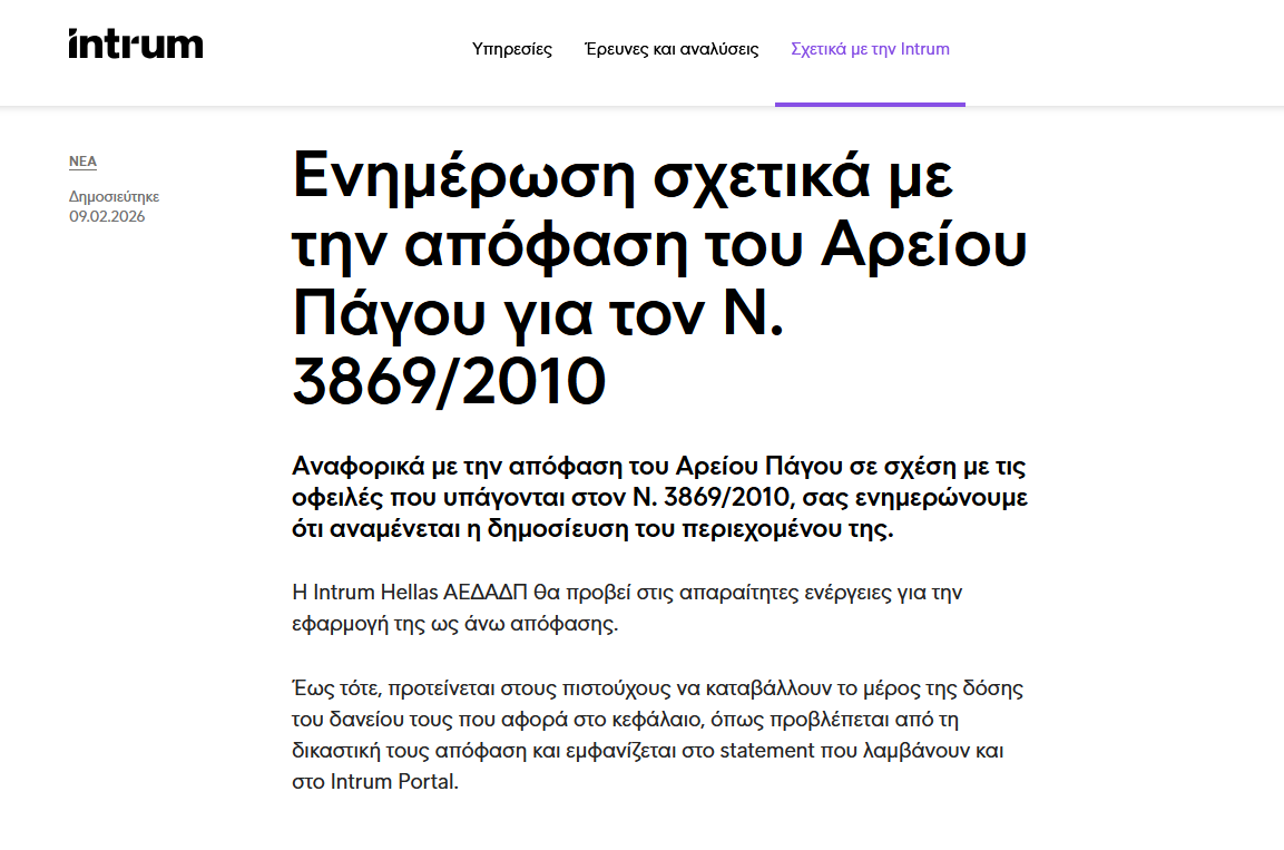 Αναφορικά με την απόφαση του Αρείου Πάγου σε σχέση με τις οφειλές που υπάγονται στον Ν. 3869/2010, σας ενημερώνουμε ότι αναμένεται η δημοσίευση του περιεχομένου της.