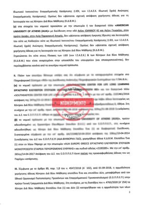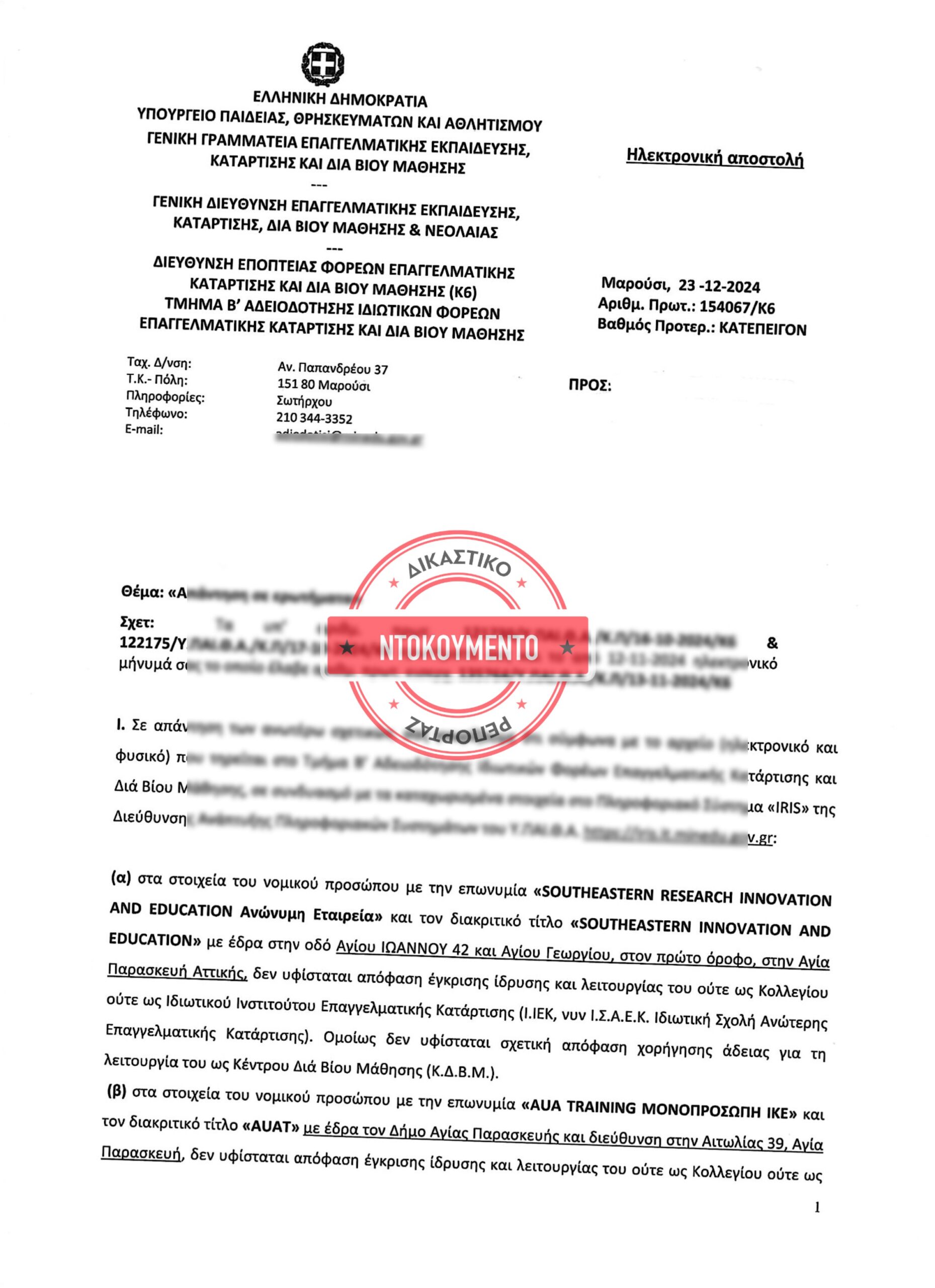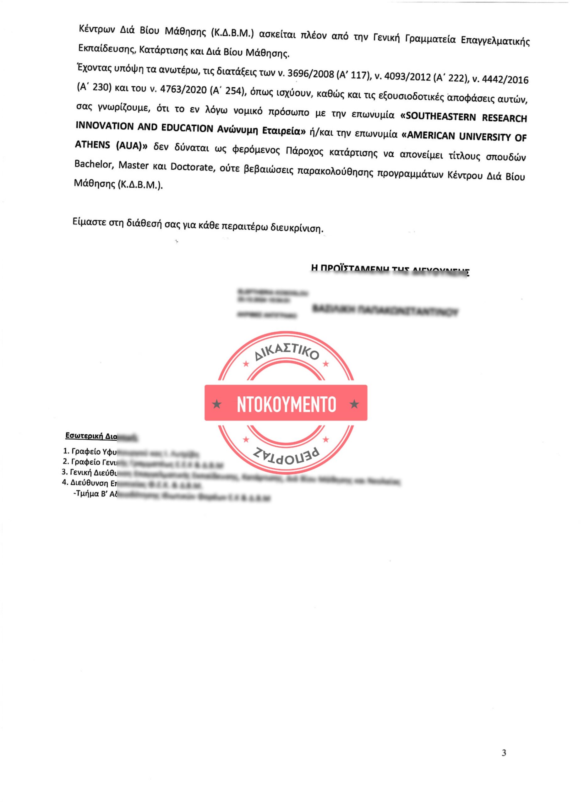 «Έχοντας υπόψη τα ανωτέρω, τις διατάξεις των ν. 3696/2008 (Α’ 117), ν. 4093/2012 (Α΄ 222), ν. 4442/2016 (Α΄ 230) και του ν. 4763/2020 (Α΄ 254), όπως ισχύουν, καθώς και τις εξουσιοδοτικές αποφάσεις αυτών, σας γνωρίζουμε, ότι το εν λόγω νομικό πρόσωπο με την επωνυμία «SOUTHEASTERN RESEARCH INNOVATION AND EDUCATIOΝ Ανώνυμη Εταιρεία» ή/και την επωνυμία «AMERICAN UNIVERSITY OF ATHENS (AUA)» δεν δύναται ως φερόμενος Πάροχος κατάρτισης να απονείμει τίτλους σπουδών Bachelor, Master και Doctorate, ούτε βεβαιώσεις παρακολούθησης προγραμμάτων Κέντρου Διά Βίου Μάθησης (Κ.Δ.Β.Μ.)» τονίζεται στο έγγραφο.
