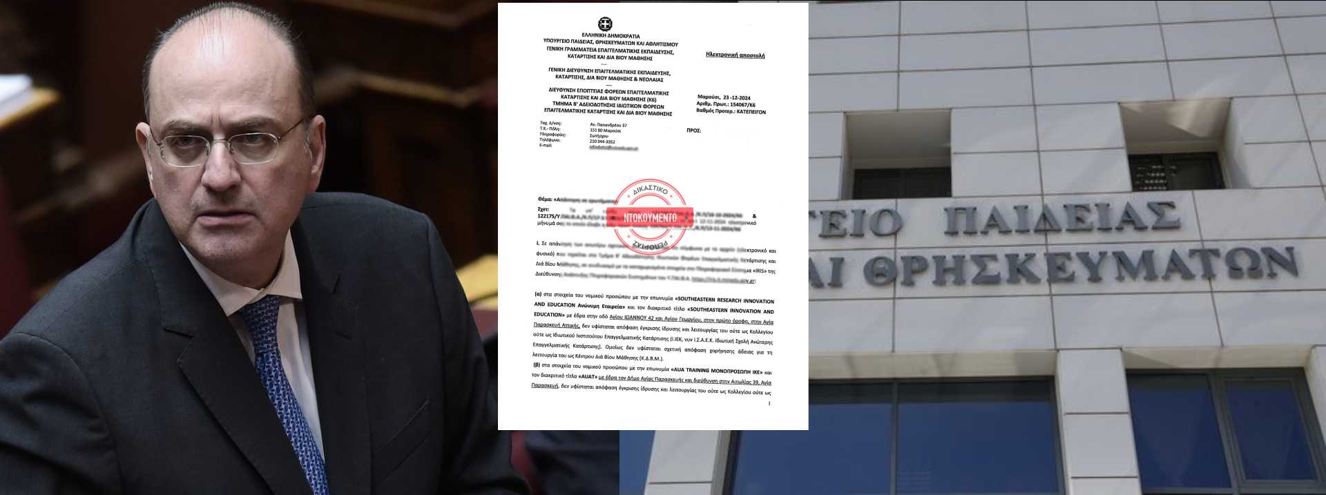 Συγκεκριμένα, όπως υπογραμμίζεται, το Southeastern Innovation and Education δεν φέρει απόφαση «έγκριση ίδρυσης και λειτουργίας ούτε ως Κολλέγιο ούτε ως Ιδιωτικό Ιντιστούτο Επαγγελματικής Κατάρτισης». Επίσης δεν «υφίσταται» ούτε απόφαση χορήγησης άδειας για τη λειτουργία του ως Κέντρου Διά Βίου Μάθησης. Το ίδιο ακριβώς νομικό καθεστώς διέπει και τη λειτουργία του American University of Athens που εδρεύει στην Αγία Παρασκευή.